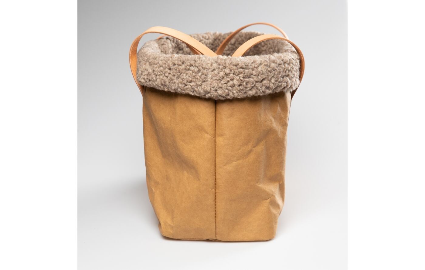 こちらのバッグ外側は、強化されたセルロースファイバーという紙素材で作られており、バッグの軽さも特徴的です。本革のレザーハンドルは、時間の経過とともに自然に色が濃くなり、柔らかくなります。