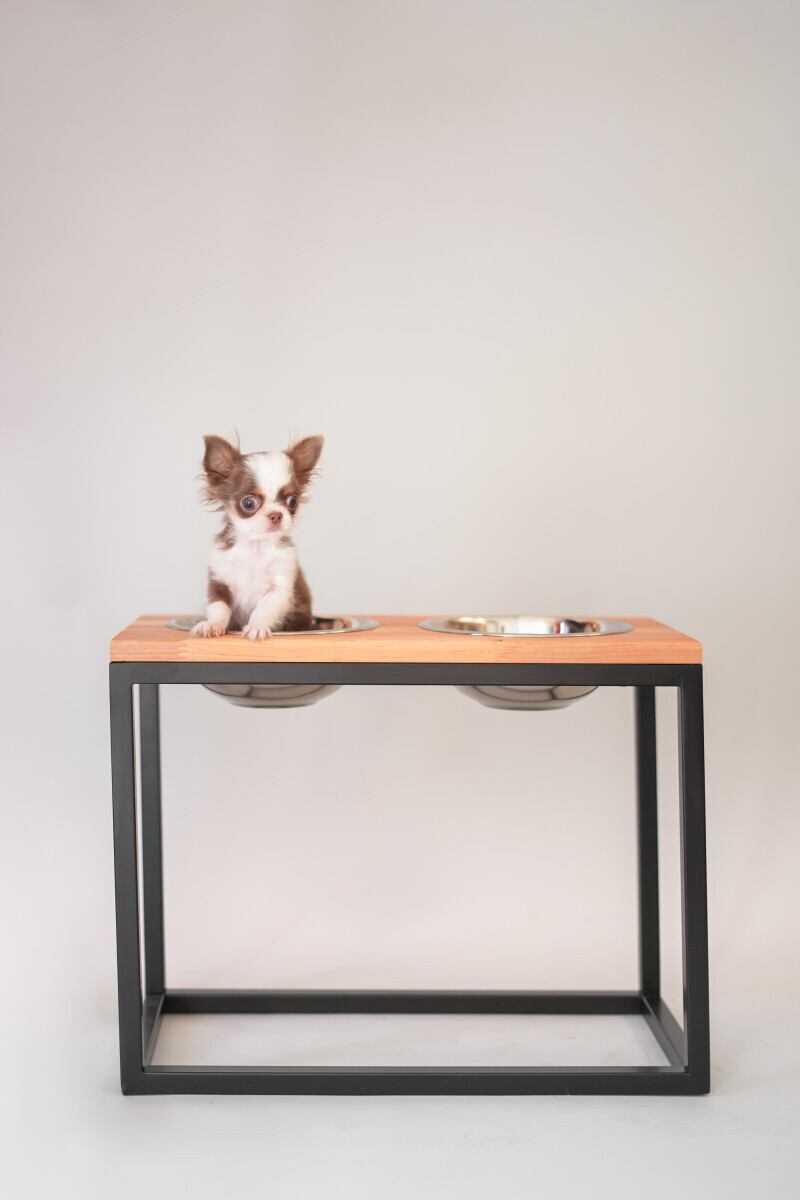温かみのある木製のテーブルボード(天板)が、オシャレで、インテリアに合う、デザイン性と機能性を兼ね備えた、大型犬用のフードボウルスタンドです。