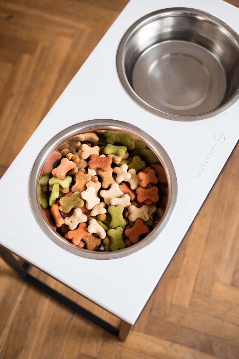 モダンな空間を演出する人工石のテーブルボード(天板)が、オシャレで、インテリアに合う、デザイン性と機能性を兼ね備えた、フードボウルスタンドです。